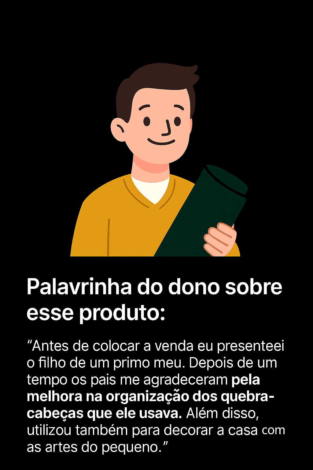 Trata-se de um belíssimo tapete apto a organizar o seu quebra-cabeça e leva-lo para onde quiser. Também é perfeito para decorar sua casa, trabalho ou qualquer lugar que esteja. Pode decorar sem o quebra-cabeça, ou melhor ainda, utilizar o quebra-cabeça, aproveitando de sua beleza, para decorar os locais que quiser por via do tapete.